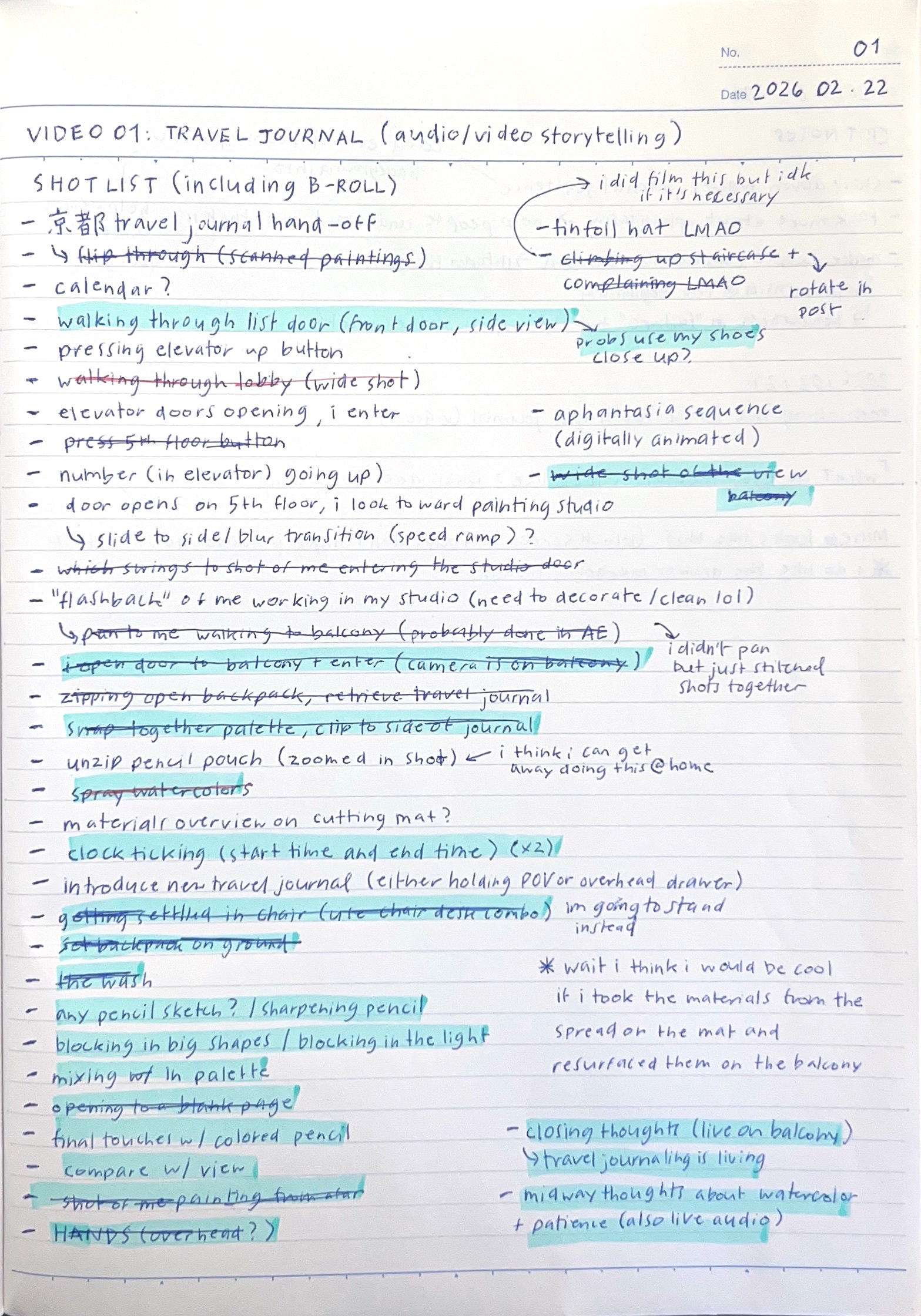 When composing my works, I plan out my film shots in a shot list as pictured above — but as a visual artist, I also storyboard these ideas if there’s a specific composition/effect I’m looking to achieve to ensure a more streamlined process.